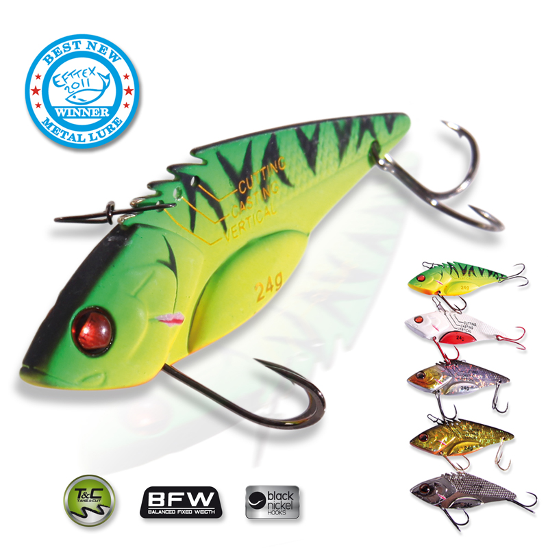 Sowohl schnell und hektisch eingeholt, als auch sehr langsam präsentiert und insbesondere auch beim Vertikalangeln, kann dieser Köder das ganze Jahr über erfolgreich gefischt werden. Das innovativste an diesem Köder freilich ist das so genannte Take & Cut-System, das es in Form einer kleinen metallenen Säge auf dem Köderrücken ermöglicht, Hänger leichter zu lösen und Unterwasserpflanzen regelrecht zu zerschneiden. Der METAL VIB wird als Neuheit für die kommende Saison gegen Ende des Jahres 2011 in drei Größen – 45mm, 55mm und 62,5mm – und 5 unterschiedlichen Farben erhältlich sein.Der Kunstköder METAL VIB‘, Teil des neuen Süßwasserprogramms von HART , wurde auf