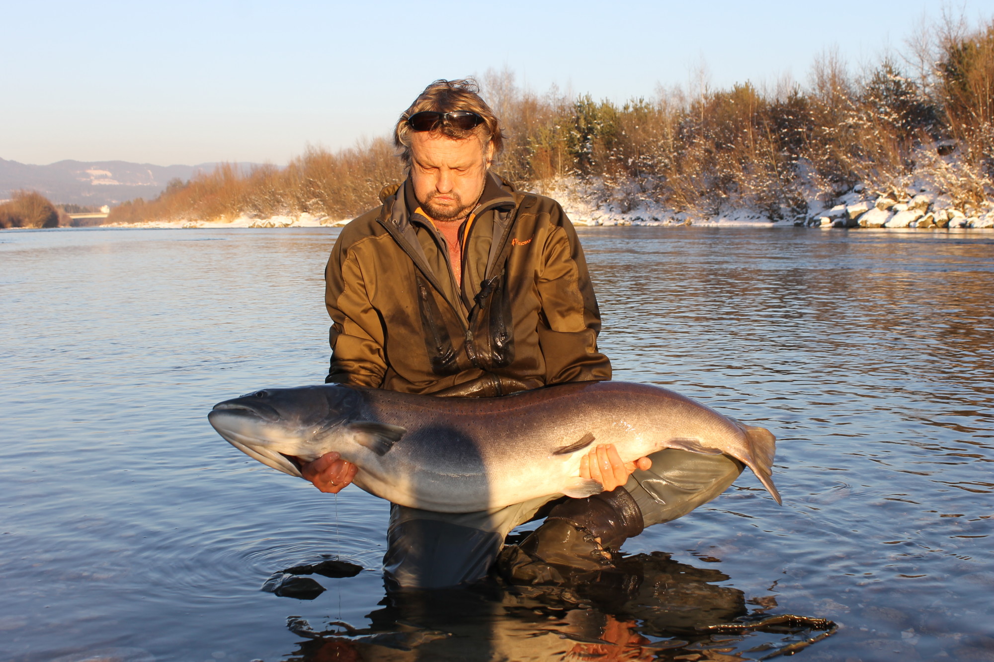 Werner knallte die Rollenbremse zu, um den stärksten Druck auf den Fisch ausüben zu können. Das machte Eindruck auf den nun merklich ermüdeten Fisch. Die Strömung kam Werner zur Hilfe und trieb den gewaltigen Fisch in seine Richtung.Werner warf die Rute aus der Hand und sich selbst auf den Fisch. Auf diese Weise konnte er einen Traumhuchen von 48 Pfund landen. Werner war glücklich, obwohl seine Wathose voll Wasser war und er während der beiden Flussquerungen fast einen Watschuh verloren hätte.