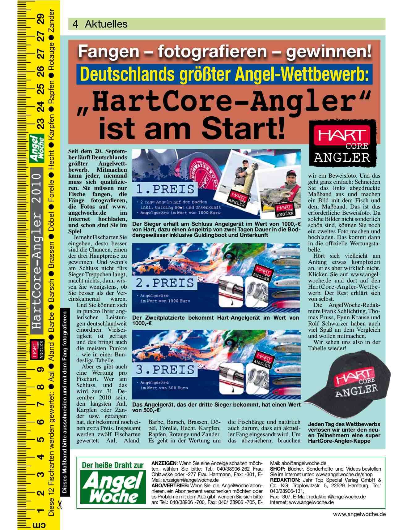 Seit dem 20. September können Sie auf www.angelwoche.de/hartcore ihre aktuellen Fänge hochladen. Das Prinzip ist ganz einfach: Es werden 12 verschiedene Fischarten gewertet, deren Einzellängen zusammengerechnet werden und so eine Gesamtlänge ergeben. Jeder kann mitmachen und tolle Preise gewinnen!