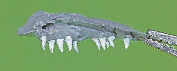Diese urtümliche Form der Zähne lässt sich heute noch bei vielen Raubfischen finden, selbst Hunderte von Jahrmillionen später. So hat ein Hecht zum Beispiel Kiefer, die gespickt sind mit fast 1.000 nadelspitzen Zähnen. Damit hält er Beute fest, bis er sich verschlucken kann. Da Fische keine Hände haben, sind ihre Kiefer die Haltewerkzeuge. Fische mit so einer Zahnausstattung können aber nur Beute fressen, die unzerkleinert durch ihren Schlund passt.