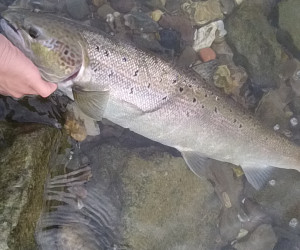 Am 8. Oktober hatte es Frederik Gennen eigentlich auf Rapfen abgesehen. Diese befischte er am Rhein mit einem Stickbait. An einer Kiesbank, die vom knietiefen Wasser direkt in die Fahrrinne übergeht, kam plötzlich ein Fisch hochgeschossen und nahm den Köder direkt unter der Rutenspitze. Durch seine Polbrille konnte Frederik im klaren Wasser genau verfolgen, wie der Fisch auf den Köder biss. Doch das war kein Rapfen, sondern ein Atlantischer Lachs. Der Fisch flüchtete mehrmals in die Fahrrinne, bevor Frederik ihn im seichten Wasser abhaken konnte. Sofort schoss der Lachs wieder in die Strömung der Fahrrinne.