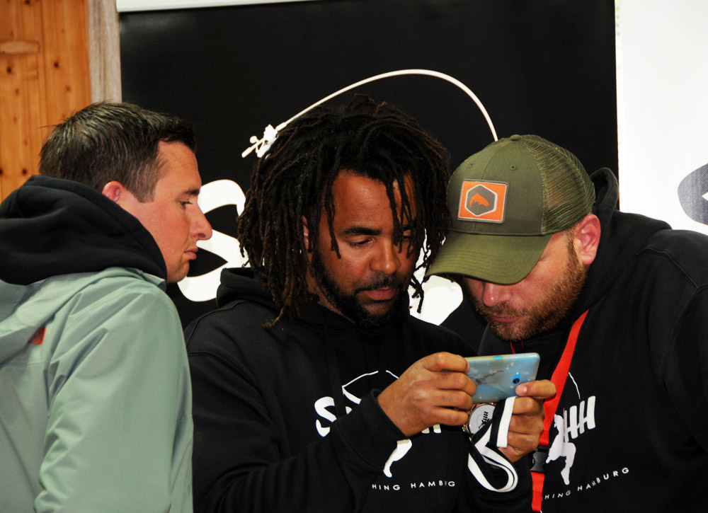 Fußball-Profil Patrick Owomoyela, Daiwa-Teamangler Rainer Ballin und Zanderexperte Veit Wilde bereiten sich auf der Preisverleihung vor. Foto: S. Kaufmann