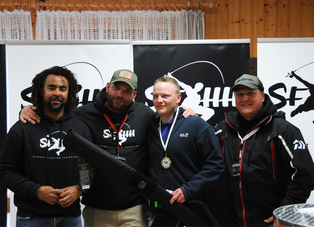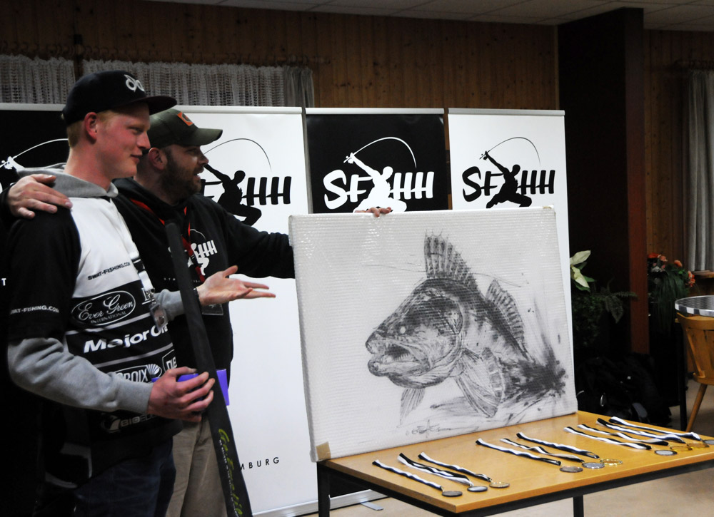 Am Ende das Tages trafen sich die über 220 Teilnehmer im Vereinshaus der A.I.G. Hamburg (Angler Interessen Gemeinschaft Hamburg e.V.), um dort spannungsvoll die Siegerehrung abzuwarten. Fußball-Profi Patrick Owomojela, Daiwa-Teamangler Rainer Ballin und auch Zander-Experte Veit Wilde hatten die ehrenvolle Aufgabe den Gewinnern die Preise zu überreichen. Dafür mussten die Teilnehmer ihre Fotos an eine im vorhinein angegebene E-Mail schicken und die Veranstalter hatten dann die verantwortungsvolle Aufgabe, die Bilder akribisch zu begutachteten und aus den vielen Fotos die Gewinner zu ermittelten. Und dann war es soweit: Die Spinnrute im Wert von über 1000 Euro ging an Tim Wehmann, der in der Hafen-City einen 88 Zentimeter großen Zander fangen konnte. Nicht nur das es der größte Zander an diesem Tag war, sondern sein Foto wurde auch als schönstes Zanderfoto auserkoren.