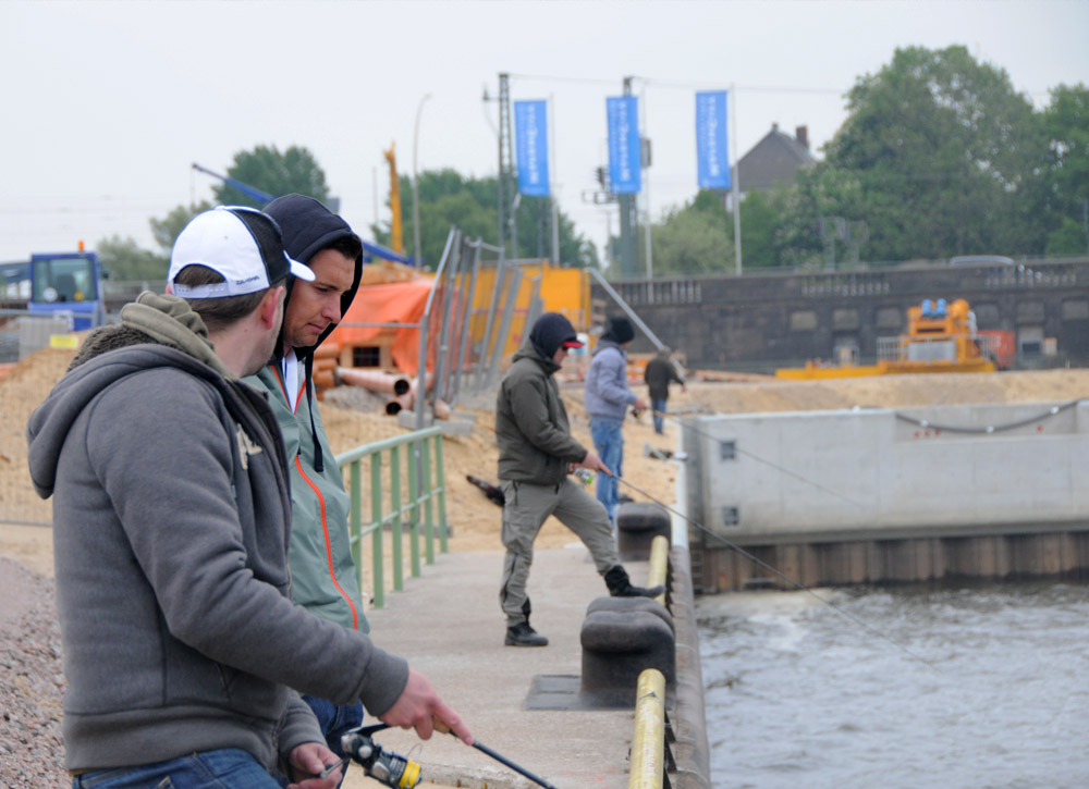 Hier stehen fünf von insgesamt 227 Angler, die am großen Streetfishing-Event in Hamburg teilnehmen. Ob an der Alster, Bille oder Elbe, überall sind die schwarz-weißen Daiwa Caps oder Umhängeschilder zu erkennen. Sie, und das peitschen der Spinnruten, bestimmen am heutigen Tag das Erscheinungsbild an den Gewässern in und um Hamburg. Aus allen Teilen Deutschlands haben Raubfischangler den weiten Weg nach Hamburg auf sich genommen, um am zweiten Street Fishing-Event teilzunehmen. Mike Brüggen, Inhaber des Angler Shop Brüggen, hat zum zweiten Mal ein grandioses Treffen auf die Beine gestellt, dass hunderte Angler zusammen brachte, wie es sonst kaum möglich wäre.
