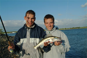 Schon um 4:30h saßen wir im Zug in Richtung Dortmund, wo uns Uli um 8Uhr abholte. Nachdem wir das Speed-Boat abgeholt und uns in Ulis riesigem Angelgeschäft noch mit den richtigen Gufis eingedeckt haben, ging`s dann endlich zum Rhein. Nachdem wir den „Kutter“ zu Wasser gelassen hatten und ein kleines Echolotproblem behoben war, ging es gegen 10:30 endlich los. Die erste Angelstelle war eine Baggerseemündung, die Uli schon immer mal befischen wollte. Der erste Blick auf seine Köderführung brachte erst einmal großes Staunen. Die kurzen, ziemlich schnellen, mit dem Handgelenk ausgeführten Twistersprünge waren für uns völlig neu. Bis dato führten wir die Köder immer mit großen Sprüngen aus dem ganzen Arm. Mit unseren Ruten war diese Technik auch gar nicht auszuführen (Ruten zu weich bzw. zu lang), weshalb wir von ihm zwei Ruten ausgeliehen bekamen. Das andere Problem war der starke Wind, der in die Schnur griff und somit das Führen des Köder stark erschwerte. Dem Könner schien er allerdings überhaupt nichts auszumachen. Seine Geflochtene war immer auf Spannung und irgendwie schien kein Wind in ihr hängen zu bleiben. Im Gegensatz zu ihm waren wir auch immer am rätseln, ob der Köder nun schon am Grund war, irgendwo darüber oder vielleicht von der Strömung ins Freiwasser gedrängt worden ist, bevor wir ihn wieder mehr oder weniger zackig hochspringen ließen. Die ersten Versuche sahen sicherlich ziemlich komisch aus… Trotzdem hatte Florian bald den ersten Fischkontakt. Der Räuber, den Uli anhand der Bissspuren im weichen Gummi als Hecht identifizieren konnte, verabschiedete sich aber nach kurzem Drill wieder. Kurz darauf konnte auch Uli einen Fisch haken, welcher aber nur ne´ Brasse war;-). Trotzdem war er es natürlich, der den ersten Zander des Tages fing: „Jetzt sind wir schon mal kein Schneider“ kommentierte er den ca.50er. Die Bedingungen waren nämlich nicht ganz so, wie wir es uns erhofft hatten. Ab und zu wurden wir mal richtig nass…Bald darauf stand Florian wieder mit krummer Rute am Kieselstrand. Und es sollte sein erster Zander werden, welcher mit 66cm auch gleich der Größte des Tages geworden ist. An diesem Fangplatz stellte sich aber kein Fisch mehr ein, und so wechselten wir ab da an regelmäßig die Angelstellen. Aber auch die Platzwechsel waren äußerst lustig. Mit Vollgas über den Rhein und über die Wellen der großen Kähne… Man musste echt aufpassen, dass nichts von Bord ging;-) Uli fing an den unterschiedlichsten Stellen hin und wieder mal einen Zander auf goldene Slottis oder Sandras, so das er am Ende des Tages auf 10 kam. Uns zeigte er manchmal, natürlich unbewusst, was für ein genialer Angler er ist. An Stellen, die von Florian und mir schon reichlich beharkt worden sind, bekam er nach zwei Würfen den Biss und wir standen überrascht daneben. Amüsant waren aber auch die Reaktionen auf seine verpassten Anschläge: „da war der Biss, schon wieder verpennt!“ So was kommt also auch den besten Anglern vor;-).Am Ende des Angeltages landete ich dann auch meinen ersten, wenngleich ziemlich kleinen Zander, nachdem ich einen anderen zuvor bereits verloren hatte. Gegen 20:00 ging´s dann wieder zurück zum Auto und Uli brachte uns zum Bahnhof in Wesel. Nach einem kleinem Zwischenstopp in Köln zur Nahrungsaufnahme waren wir um 1 Uhr total übermüdet endlich wieder zu hause. In Erinnerung bleibt ein wunderbarer Angeltag mit einem super netten Starangler, der uns zu unseren ersten Zandern verholfen hat und die Erkenntnis, dass selbst die perfekte Köderpräsentation für uns ein unerreichbares Ziel bleiben wird… Zumindest für die nächsten 10 Jahre. Denn so was akkurates haben wir noch nicht gesehen. Vielen Dank Uli! Florian und Raphael