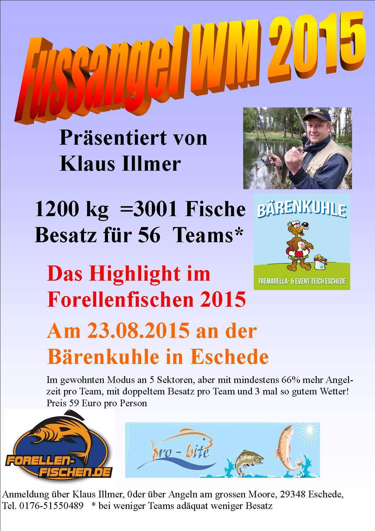 Die wunderschöne Teichanlage „Angeln am großen Moore“ in Eschede ist parkartig angelegt. In diesem Ambiente findet am 23. August die große Fußangel-WM an der „Bärenkuhle“ statt. 56 Teams aus jeweils zwei Anglern fischen um den WM-Titel. Veranstaltet wird das Ganze von Klaus Illmer und dem Anlagebetreiber Herr Thoma. Auch für das leibliche Wohl ist in Form von Getränke- und Imbissbuden gesorgt. Preis: 59 Euro pro Person.