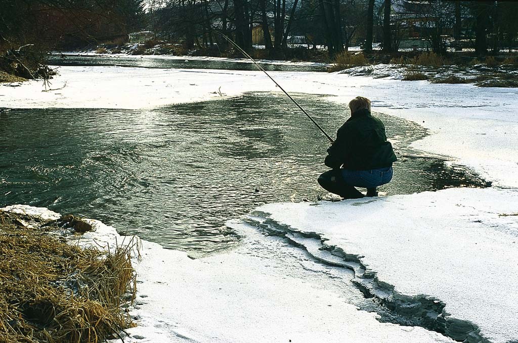 Dort, wo das Wasser in einem Fluss am wenigsten strömt, bildet sich zuerst eine Eisschicht. In tiefen Außenkurven und an Einläufen von Bächen dagegen kann man auch noch angeln, wenn der übrige Fluss schon zugefroren ist. Am einfachsten lassen sich solche Spots über das Internet finden. Über Google Maps oder Google Earth lassen sich interessante Angelstellen bequem aus der warmen Stube suchen.
