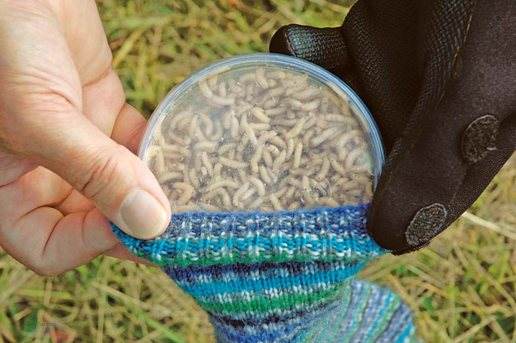 Naturköder fangen während der kalten Jahreszeit mitunter am besten. Damit die Maden und Würmer nicht erfrieren und damit unbrauchbar werden, müssen sie an einem warmen Ort deponiert werden. Am besten packt man sie in einen dicken Strumpf und steckt sie in eine große Jacken- oder Hosentasche. Die Körperwärme hält die Krabbler am Leben und sichert uns den Angeltag.