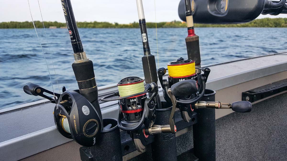 Alle Rollentypen auf einen Blick: Oben links befindet sich eine schwere Multirolle, darunter die Baitcasterrolle zum Spinnfischen und rechts daneben eine klassische Stationärrolle. Foto: J. Pusch