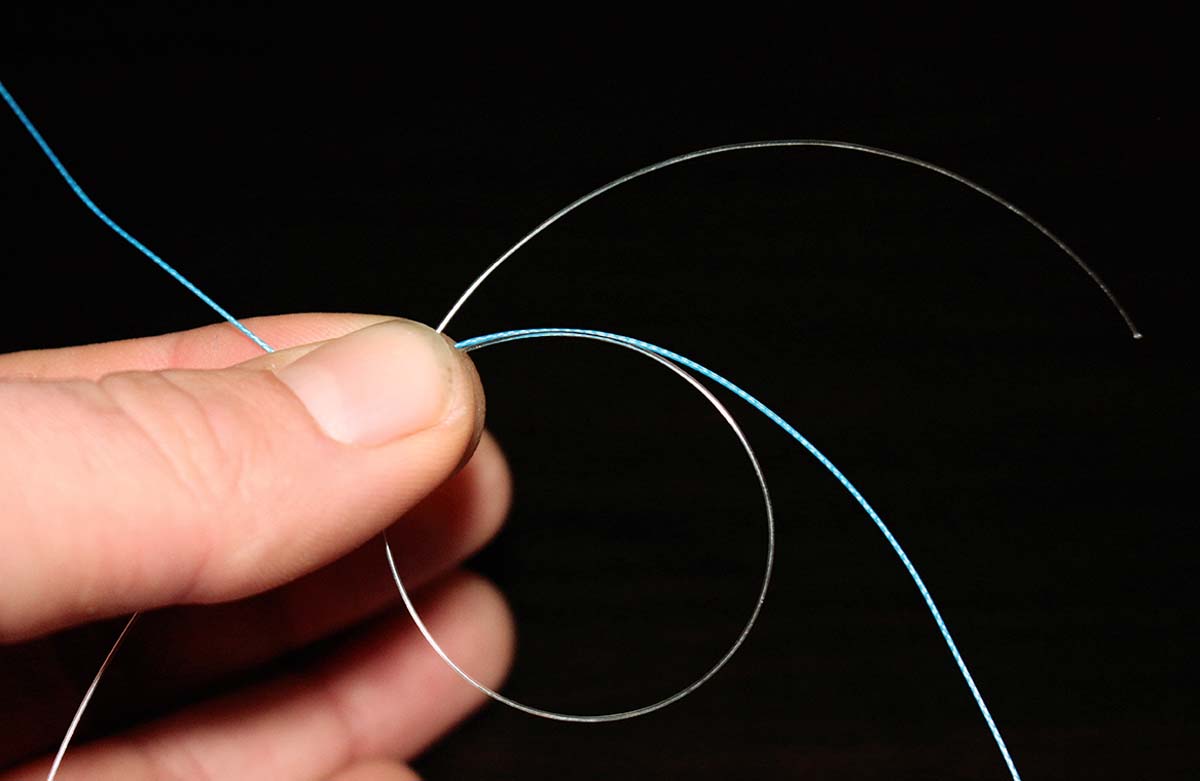 - Es folgen fünf Wicklungen mit der geflochtenen Hauptschnur um den Schlaufenbogen und die Monofile.