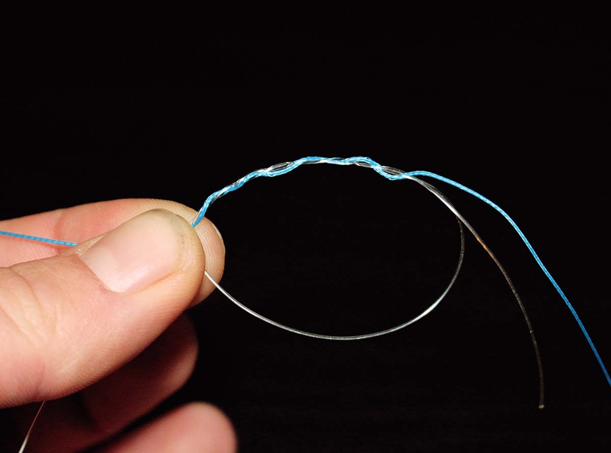 - Dann wickelst Du die Schnur fünfmal (bei dünnerer Schnur gerne noch etwas öfter) um die Schlaufe und führst sie schließlich durch das Auge.