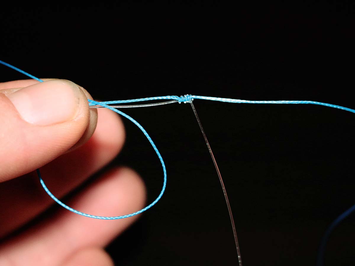 - Jetzt wird mit dem Geflecht eine Schlaufe neben dem zuvor entstandenen Knoten gelegt. Daumen und Zeigefinger halten auch hier die Schnittstelle samt Monofiler fest zusammen.