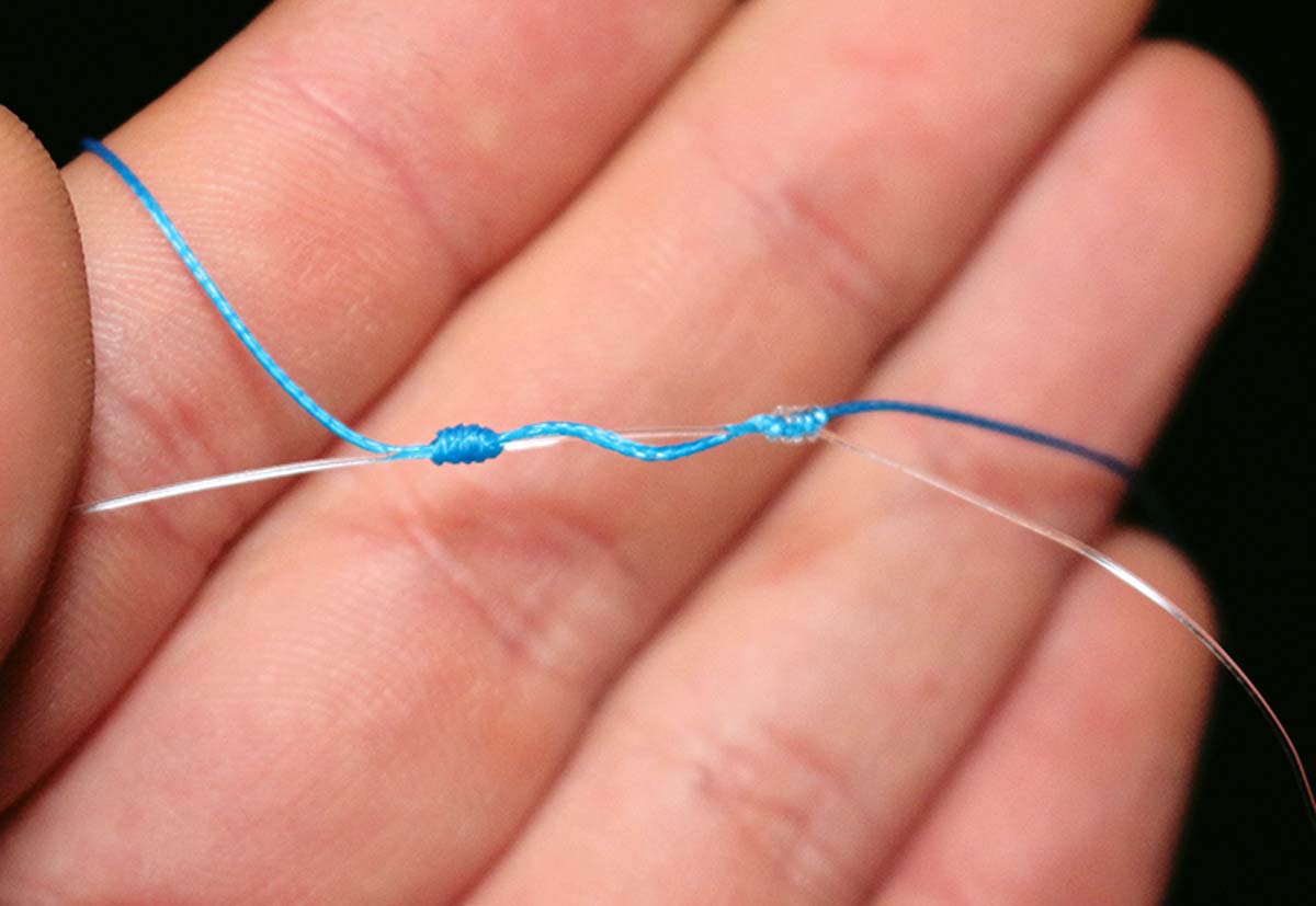 Für die Verbindung unterschiedlich starker und verschiedener Schnüre kommt man am Doppelten Grinner-Knoten nicht vorbei. Er hat bei monofiler Schnur eine Tragkraft von circa 75 Prozent und bei Geflecht sogar 90 Prozent. So lässt sich zum Beispiel ein monofiles Vorfach (oder auch Fluorocarbon) – , so wie man es vom Zanderangeln kennt, mit der geflochtenen Hauptschnur verbinden. Der Vorteil gegenüber einen No-Knot-Verbinder ist, dass der Knoten ohne große Reibungsverluste durch die Rutenringe flutscht. Bei etwas dickerer monofiler Schnur sollte man jedoch lieber zum Albright bzw. verbesserten Albright-Knoten zurückgreifen. Dieser lässt auch Schnüre mit größeren Durchmessern besser durch die Rutenringe gleiten. So werden Beschädigungen der Ringeinlagen verhindert. Außerdem ist der Doppelte Grinner-Knoten sehr schnell und einfach zu binden. Wenn man sich ein paar Mal an ihm ausprobiert hat, wird man ihn immer wieder verwenden wollen – garantiert!