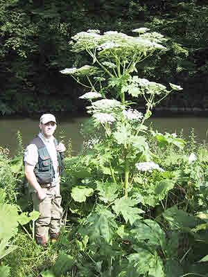Die Pflanzen wachsen häufig am Ufer von Gewässern, da hier ihre Samen angetrieben werden. Besonders wir Fischer sind deshalb gefährdet. Der Doldenblütler ist um die Jahrhundertwende vom Kaukasus nach Europa eingeschleppt worden. Zuerst als Zierpflanze in Gärten verwilderte sie und verbreitet sich nun aufgrund fehlender Fressschädlinge besonders in den letzten Jahren sehr stark. Bei Berührung der Pflanze und besonders bei Hautkontakt mit dem Saft, wird unter Einfluss von Sonnenlicht eine phototoxische Reaktion (Reaktion des Pflanzensaftes mit Sonnenlicht) ausgelöst. Die Folgen sind Rötung der Haut, Schwellung, Blasenbildung und Hautverfärbungen bis hin zu starken Verätzungen. Häufig bleiben dunkle Narben zurück. Beachtet, dass die gesamte Pflanze (besonders Blätter und Stamm) giftig ist, also auch die Wurzeln!! Verstärkt wird die Wirkung zusätzlich durch hohe Luftfeuchtigkeit und Schweiß. Die Entzündungen können über längere Zeit (mehrere Monate) bestehen bleiben. Sollte der Planzensaft mit den Augen in Berührung kommen, droht Erblindung. Gerade für Kinder sind solche Riesenpflanzen natürlich besonders interessant und so sind sie besonders gefährdet. Sollte man sie trotzdem berührt haben ist folgendes zu beachten. Unbedingt sofort Sonnenlicht meiden, Arzt aufsuchen Bei der Entfernung der Pflanze sind folgende Punkte zu beachten: Unbedingt dicke Schutzkleidung (SCHUTZBRILLE!!!) tragen. Haut bedecken!!! Kinder sind fernzuhalten. Haut- und Augenkontakt vermeiden Kleine Pflanzen ausgraben (mind. 20cm tief) Nur in die Restmülltonne geben, wenn der Müll verbrannt wird. Sonst direkt und vollständig verbrennen (wenn erlaubt) Nicht auf den Kompost werfen, da sie hier wieder austreibt und auf nährstoffreichem Boden dann doppelt so schnell wächst Es reicht nicht die mehrjährige Pflanze einfach abzuschneiden, da sie im nächsten Jahr wieder austreibt Der Gips meines Fischerkollegen Detlef auf dem Foto ist übrigens nicht von der Pflanze verursacht. Die Fotos oben und unten sind an der Agger und das mittlere Bild an der Lenne im Sommer 2001 entstanden. Thomas Vogt www.vogt-naturfotografie.de Bericht von Thomas Vogt