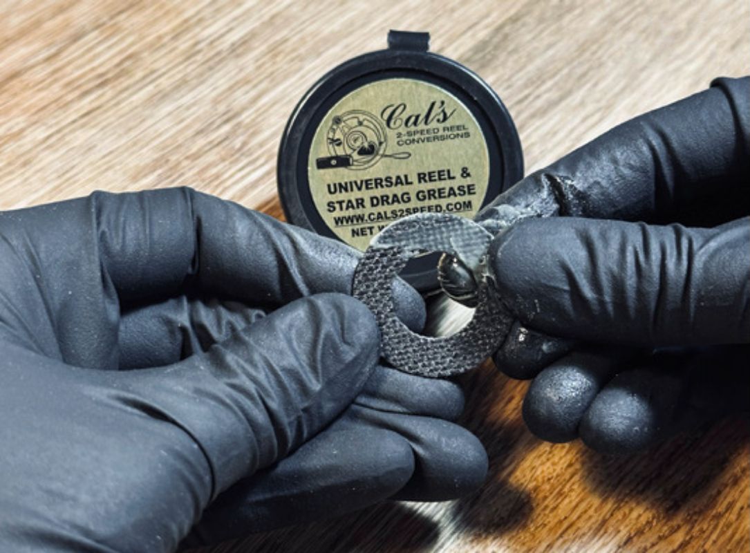 Die Bremsscheibe einer Angelrolle wird während einer Wartung gefettet.