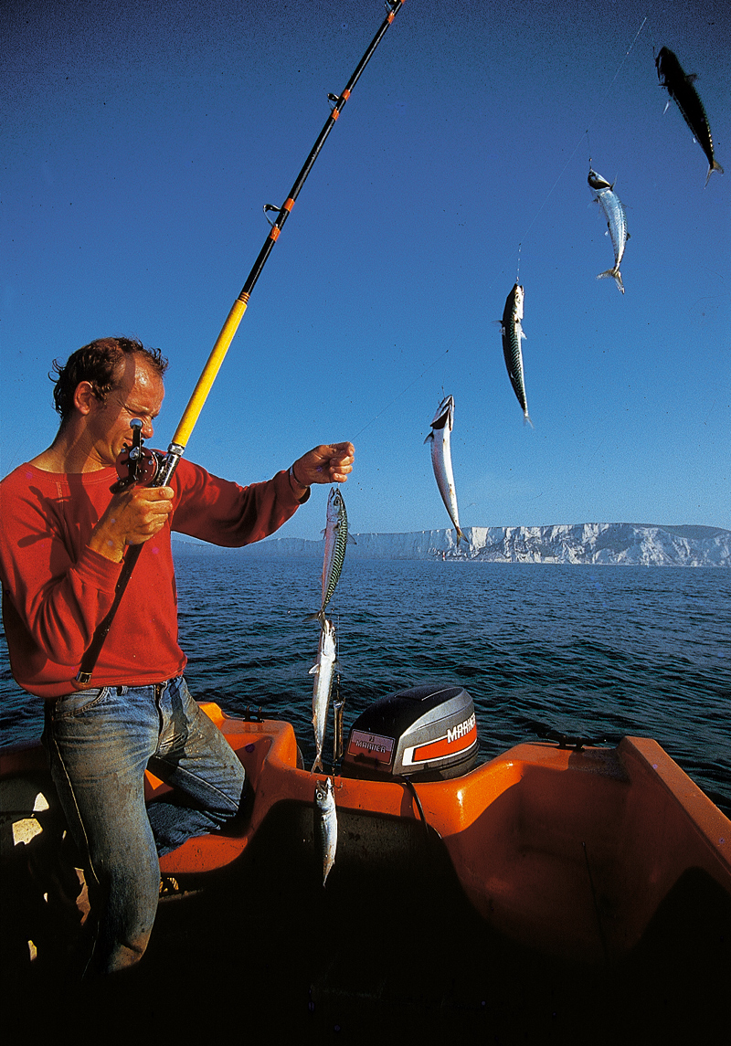 Oft genug fängt man an solchen Stellen neben vielen Makrelen auch große Fische wie Dornhaie oder Dorsche, die unter den Makrelen stehen. Die Kutterkapitäne, die im Sommer von vielen Nordseehäfen in Holland, Deutschland oder Dänemark zum Makrelenangeln hinausfahren, verlassen sich natürlich nicht (nur) auf die Möwen. Mit Funk und Echolot spüren sie die Schwärme auf, die sich im Freiwasser oft nahe an der Oberfläche aufhalten. Makrelen durchstreifen also im Hochsommer die warmen, küstennahen Gewässer. Das heißt aber nicht, dass sie flaches Wasser mögen. Ganz im Gegenteil: Zehn Meter salziges Wasser wollen sie unter ihrer hübsch gegabelten Schwanzflosse schon haben.