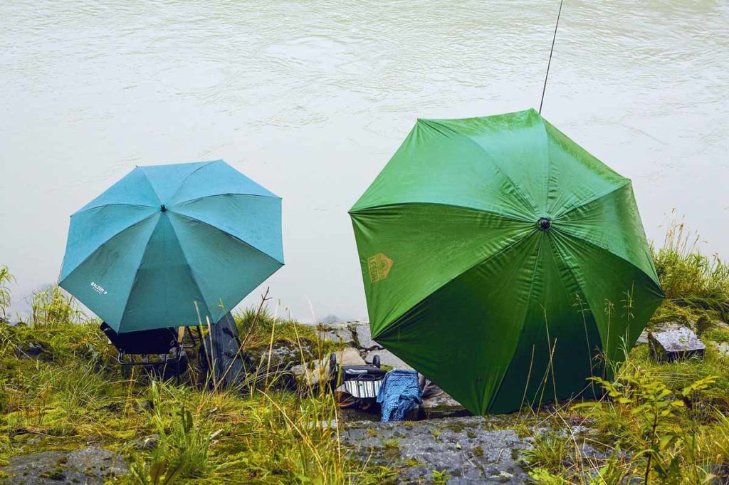 In solchen Fällen werden Heringe unentbehrlich, wie man sie vom Camping kennt. Dann muss der Schirm nämlich nicht zwingend frontal mit der Rückseite zum Wind stehen, sondern kann auch leicht seitlich aufgestellt werden. Bei einem Angelschirm sollten also auch immer ein paar Heringe und Schnüre dabei sein. Denn erst, wenn ein Schirm wirklich sicher am Boden fixiert ist, kann man ganz entspannt angeln. Egal wie stark es regnet oder bläst.