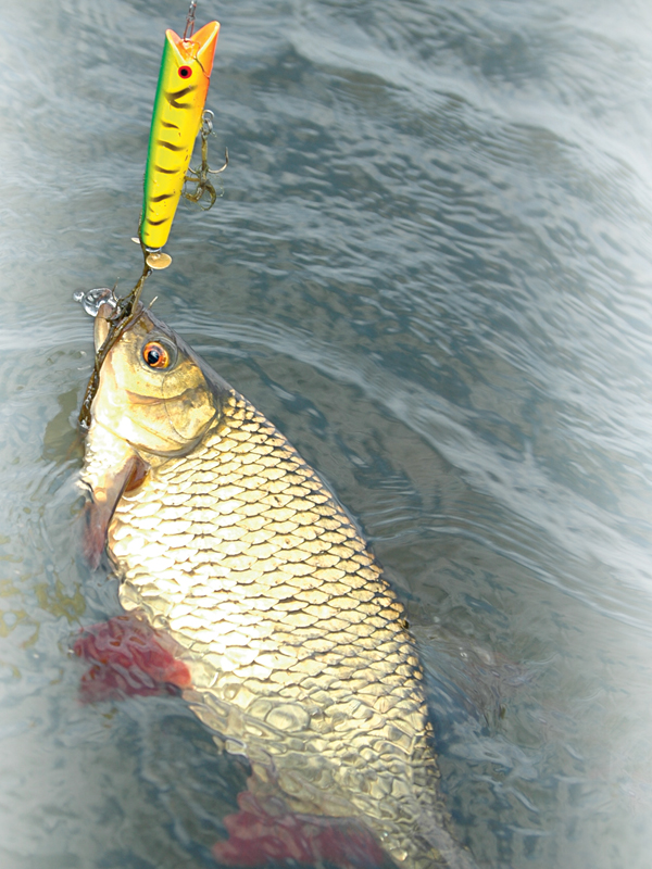 Mit der kleinen Insel im Wolgadelta, auf der die Lodge steht, hat es eine ganz besondere Bewandtnis. Aber das ist eine Geschichte, die man erst nach ein paar Wodka erzählen darf, und dafür ist es noch zu früh. Also noch etwas Geduld. Bemerkenswert ist aber auch, was sich in dem achen Wasser vor der Insel abspielt. Keine Sekunde vergeht, ohne dass man Fische sieht. Kleinsche spritzen aus dem Wasser, ein Barsch springt hinterher. Weißschschwärme auf Nahrungssuche, Hechte, die sich anschleichen und plötzlich in den Schwarm stoßen. Eine Schlammwolke gibt langsam den Blick auf einen Hecht frei, in seinem Maul eine Rotfeder. Nahe am Ufer sammeln sich Jungsche. Schon werden sie attackiert, dieses Mal von einer großen Rotfeder. Voll emanzipiert steht der räuberische Friedsch neben einem Junghecht und verdaut seinesgleichen. Es wimmelt um die Insel herum nur so von Fischen. Als wir einmal für einen Ansitz auf Wels ein paar Ködersche fangen wollten, war das innerhalb weniger Minuten erledigt. Ohne Anfüttern, ohne besonders feines Gerät, ohne sonderlich attraktiven Köder. Eine Scheibe Mettwurst aus der Küche der Lodge hatte genug kleine Fettstückchen, um damit 20 Weißsche zu fangen. Die Scheibe hätte sogar für dreimal so viele Fische gereicht. Außer auf Wels und auf Ködersche wird aber kaum mit Naturködern geangelt. Beim Raubschangeln werden bevorzugt Kunstköder eingesetzt. Das ist spannender und effektiver, weil die Bisse oft Schlag auf Schlag kommen. Sergei Borovikov, der Besitzer der Lodge, stattet mich für den ersten Angeltag mit einer Handvoll Ködern aus, alles Oberächenköder. Sergej erkennt meine Verwunderung und gibt mir zu verstehen, dass ich dieser Köderwahl vertrauen soll. Doch erst einmal muss ich Vertrauen zu einem unendlichen Wasserlabyrinth aus Seen, Teichen, Kanälen, Gräben und Sümpfen zwischen Schilfinseln und Auenwäldern fassen. Alle Gewässer stehen miteinander in Verbindung und bilden über viele viele Kilometer den Irrgarten des Wolgadeltas, in den man sich niemals ohne Guide wagen sollte. Meine Kollegen der russischen Angelpresse kennen sich hier gut aus. Zum Fotograeren und Filmen fahren sie häuger ins Wolgadelta, weil sie dort immer genug schuppige Akteure vor das Objektiv bekommen. Mit vier Booten rasen wir durch den Wasserdschungel, als wären wir auf einer gut beschilderten Autobahn. Dann tut sich vor uns eine weite Wasseräche auf, mein Guide drosselt den Motor und ankert an einer Krautinsel. Ohne Worte deutet Sergei so heißt auch der Guide an, dass das Wasser höchstens einen Meter tief ist, wir rund ums Boot werfen können und am besten mit Spinnern anfangen. Gesagt, dass heißt nicht gesagt, aber doch getan.