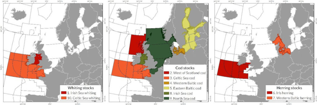 Die 25 Fischbestände teilen sich auf 12 Arten auf. Diese sind: Sardelle, Blauleng, Dorsch, Aal, Hering, Stöcker, Kaisergranat, Granatbarsch, Tiefenrotbarsch, Sandaal, Sardine und Wittling. Pro Art befindet sich mindestens eine Population in diesem kritischen Zustand. Besonders der Dorsch sticht bei den Daten hervor. Insgesamt 9 seiner Fischbestände im Nordatlantik sind vom Verschwinden bedroht.