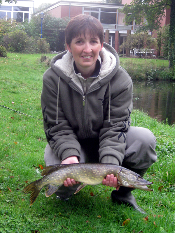 Doris‘ erster Fisch war ein 65 Zentimeter langer Hecht, den sie im Vereinsgewässer auf einen Frogger überlisten konnte. Nach dem Erlebnis war sie nun voll und ganz mit dem Angelvirus infiziert. In jeder freien Minute war Doris am Wasser. Sie entwickelte sich in kurzer Zeit zum echten Spezi was das Angeln am Dattel-Hamm-Kanal angeht. Schöne Rapfen und Barsche konnte Doris dort schon verhaften. Da staunen die Männer im Verein nicht schlecht.