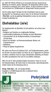 Wir suchen eine Person mit fundierten Fisch- und Gewässerkenntnissen, perfektem Deutsch und gutem Englisch. Sie führen bei uns in Rapperswil am Zürichsee ein kleines, motiviertes Team mit Layout, Administration, Marketing und Verkauf. Sie sollten journalistisches Flair auch für neue Medien mitbringen.