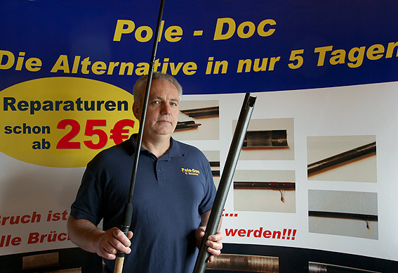 Die sündhaft teure Kopfrute hat einen Riss bekommen oder ist sogar gebrochen? Nun ist guter Rat bzw. der Neukauf eines Ersatzteils teuer, es sei denn, man kennt den Pole-Doc. Rutendoktor Ralf Rosarius hat sich auf die Reparatur von Kopf- und Matchruten aller Art spezialisiert. Repariert werden können alle Arten von Brüchen und Rissen. Da beim Pole-Doc die Bruchstellen nicht überklebt, sondern mit neu aufgetragenem Werkstoff verbunden werden, entsteht bei wesentlich weniger Materialdicke eine vielfach höhere Festigkeit. Der Preis für jede Reparatur wird anhand von Bildern, die man dem Rutendoktor per E-Mail zusenden kann, oder nach in Augenscheinnahme vor der Bearbeitung festgelegt. Die Kosten belaufen sich zwischen 30 und 40 Euro. Bei Splitterbrüchen und fehlenden Teilen werden die Kosten nach Aufwand berechnet. Weitere Informationen erhalten Sie bei Ralf Rosarius, Zehnthofweg 1, 52379 Langerwehe, Telefon 02423-1784, Mobil 0179-6700051 und im Internet unter www.pole-doc.de.