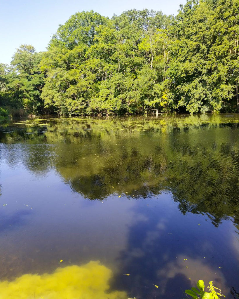 Um eine Verlandung des Gewässers zu verhindern, wurden Wasserlinsen und Laub entfernt.