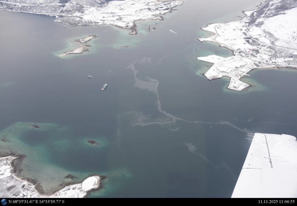 Aufnahmen der Küstenwache vom 11.11.2025 zeigen den Ölfilm im Wasser.