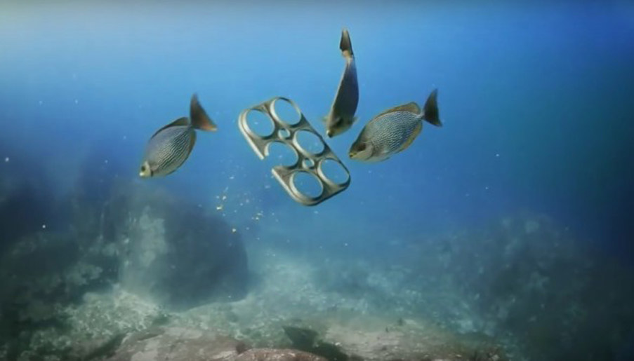 Die Sixpack-Halterung der Firma Saltwater Brewery kann von Wasserbewohnern vollständig aufgefressen werden. Foto: Screenshot Yotube