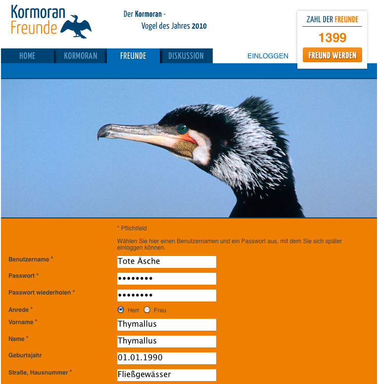 Wenn man Freund werden will, muss man sich über ein Formular einloggen, das wars. Ist ja nur symbolisch, da muss man nicht anspruchsvoll sein. Wie wir gerade erfahren haben, hat auch eine Äsche das mit dem Freund werden versucht. Sie hat es nicht mehr geschafft! Bevor es der Äsche gelang, ihre kompletten Daten einzugeben, war sie ausgestorben