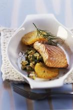 4 Lachsfilets (à 150 g; TK oder frisch) 1 EL Olivenöl 2 Orangen 1/2 Avocado 4 EL grüne Oliven ohne Stein Salz, Pfeffer aus der Mühle 2 Stiele frischer Dill oder 1 EL TK-Dill