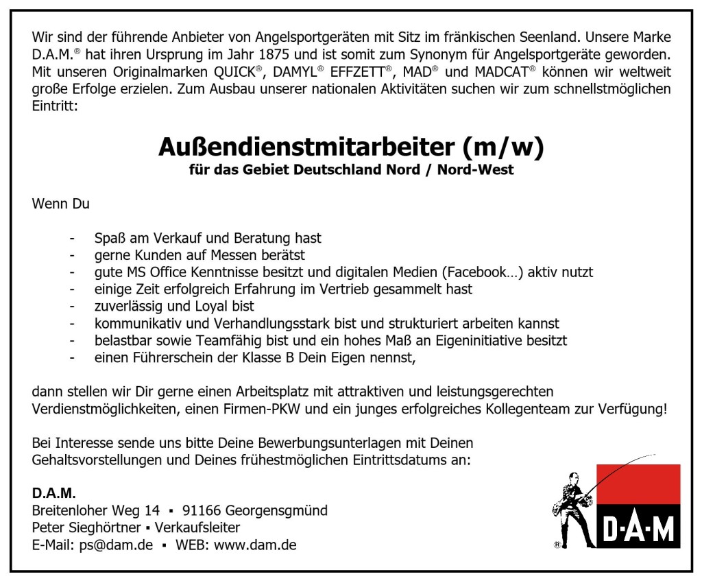 Du möchtest Dein Hobby zum Beruf machen? Dann kommt hier Deine Chance! Denn die Firma D.A.M., Anbieter von Angelsportgeräten mit Sitz im fränkischen Seenland, sucht für sein Team tatkräftige Unterstützung. Wenn Du neben dem Angeln auch gerne mit Leuten in Kontakt trittst, gute MS Office Kenntnisse besitzt und die digitalen Medien kein Fremwort für Dich sind, dann bewirb Dich als Außendienstmitarbeiter für das Gebiet Deutschland Nord / Nord-West. Alle weiteren Informationen zur Stellenausschreibung erfährst Du in der nachstehenden Anzeige: