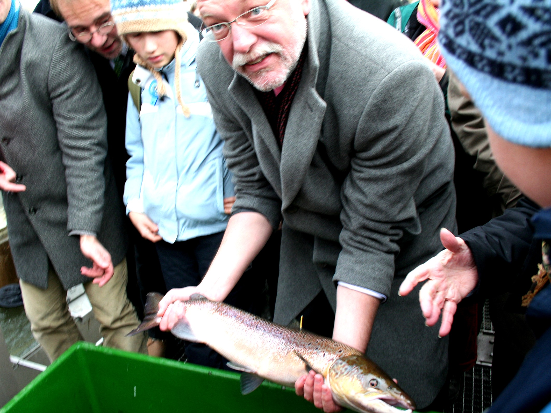 Staatssekretär des NRW-Umweltministeriums Dr. Alexander Schink mit einem Lachs aus der Sieg.