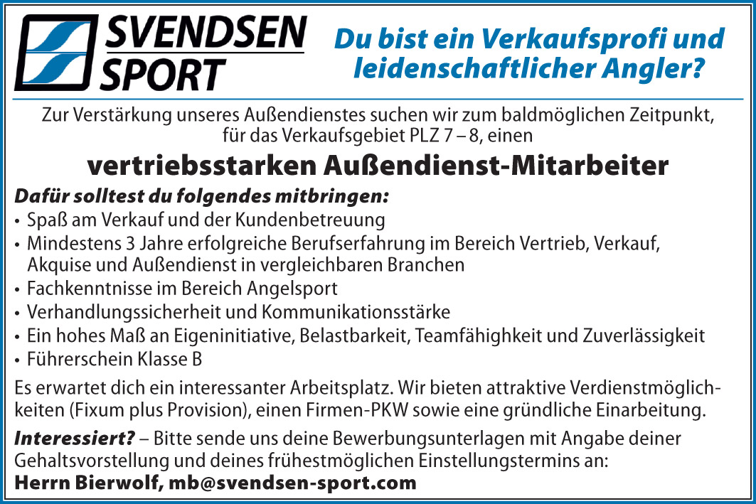 Die dänische Firma Svendsen Sport, zu den die Marken Okuma, Savage Gear, Prologic, Water Wolf, Ron Thompson, Imax, Lenz Optics and Scierra gehören, sucht zum nächstmöglichen Zeitpunkt einen Außendienstmitarbeiter für die Regionen Stuttgart und München. Alle weiteren Infos zur Stellenausschreibung findest Du in der Anzeige.