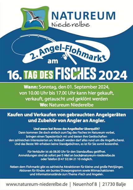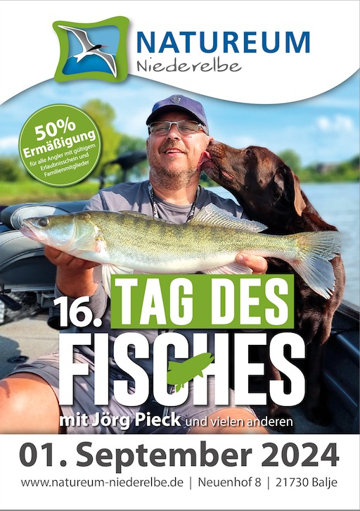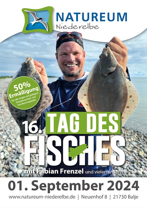Am 1. September findet in Balje bei Cuxhaven an der Nordsee beim Natureum Niederelbe bereits zum 16. Mal der „Tag des Fisches“ statt. Von 10:00 bis 17:00 Uhr wird dort richtig was geboten: Mit dabei ist auch unser Autor und freier Mitarbeiter Fabi Frenzel, der dort als Weltmeister im Brandungsangeln einen interessanten Vortrag halten wird. Fabi ist aber auch ein Forellen-Experte – genau genommen ein echtes Allround-Talent. Dort werdet ihr die Möglichkeiten haben, mit ihm mal so richtig schön zu fachsimpeln.