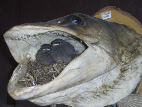 Wären diese kleinen Küken nach dem Schlüpfen versehentlich ins Wasser gefallen, hätte der Hecht zu Lebzeiten mit ziemlicher Sicherheit zugeschnappt. In diesem Fall brachte aber der einst gefürchtete Jäger nicht den Tod, sondern diente lange nach seinem Dasein als rettender Geburtshelfer. Der Besitzer des präparierten Hechtkopfs, Sigfried Weiss, betreibt in einer oberschwäbischen Kleinstadt einen nebenberuflich Angelshop und konnte seinen Augen kaum trauen, als er diese ungewöhnliche Entdeckung machte. Zum Schutz vor Wind und Regen baute ein Rothkehlchenpaar ein gemütliches Nest im riesigen Hechtmaul. Da der Fischkopf in einer Höhe von 1,80 Meter hängt, konnte Shopbesitzer Sigfried Weiss die Geburt von Anfang an live erleben.