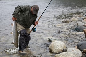 Die Gaula in Norwegen ist bekannt für ihre großen Lachse! Hier landet Michael Werner gerade einen 8 Kilo schweren Lachs im Bridge Pool.
