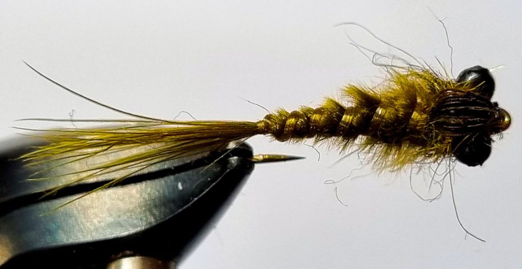 - Thorax: Dark Olive Pheasant Tail & SLF Dubbing