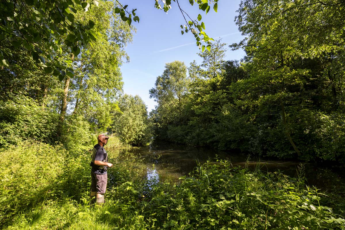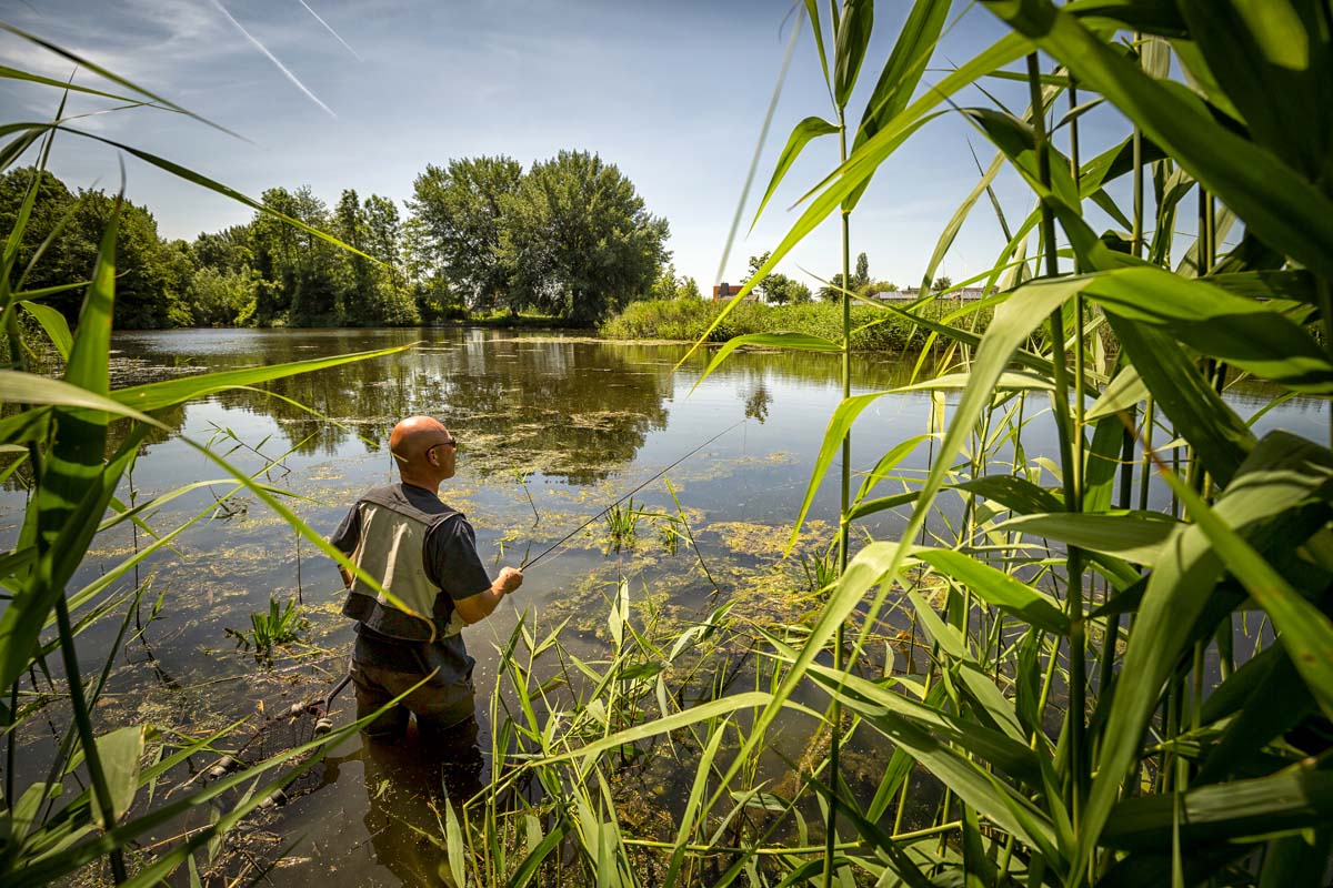 Jeroen zieht wieder an den Seiten des schmalen Gewässers entlang, auf der Suche nach weiteren Rotfedern. Plötzlich dreht er sich um. „Wir gehen besser wieder zur Brücke. Rotfedern schwimmen in der Gruppe. Wenn man eine sieht, ist die Gruppe meistens in der Nähe. Mein Gefühl sagt mir, dass sich an der Brücke noch mehr befinden müssen. Die anderen können nicht weit weg sein.“ Zurück an der verheißungsvollen Stelle läuft Jeroen – geschützt durch Watstiefel –vorsichtig in das Wasser. Etwas anderes ist hier aufgrund des vielen Riets nicht möglich. Den Fischen ist es, so Jeroen, egal, ob man durch das Wasser läuft. „Ein Fisch erschreckt nicht so schnell, wenn etwas durch das Wasser läuft. Manchmal schwimmen sie keine 2 Meter an meiner Nase vorbei. Auf einen Angler am Ufer reagieren sie viel empfindlicher.“