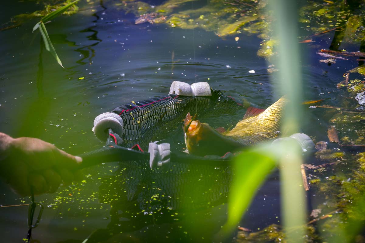 „Hängt“, sagt er mit kräftiger Stimme. Bereits nach nur zwei Zügen hing der Fisch und seine Taktik ging auf. „Ein schöner, eindeutiger Biss. Ich konnte ihn nicht sehen, aber an der Schnur spüren. Er hing direkt, ich brauchte nicht viel zu tun“, so ein begeisterter Jeroen, der inzwischen seinen Kescher zur Hand nimmt. Diesen hat er mit Kunststoff schwimmfähig gemacht, sodass er den Fisch – wenn er allein ist – im Netz schwimmen lassen kann, um seine Kamera vorzubereiten. Das ist natürlich in Anwesenheit von Fotograf Sander Boer nicht nötig.