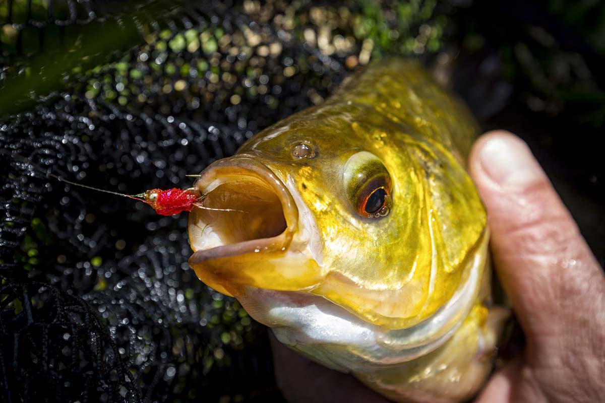 Nach ein wenig Widerstand unter der Wasseroberfläche gibt sich der Fisch geschlagen. Geschafft! Die Nymphe befindet sich in der Oberlippe und wird mühelos entfernt. „Trotzdem muss man bei dieser Angelmethode immer einen Hakenlöser mitnehmen. Einen mit großer Öse, den man über die Perle der Nymphe schieben kann. Die großen Kerle haben nämlich ziemlich große Mäuler. Es kann sein, dass der Haken etwas tiefer rutscht “, sagt Jeroen, während er mit der prächtigen Rotfeder posiert. Der Fisch misst exakt 38 Zentimeter. Und das auf Fliege. Eine tolle Geschichte.