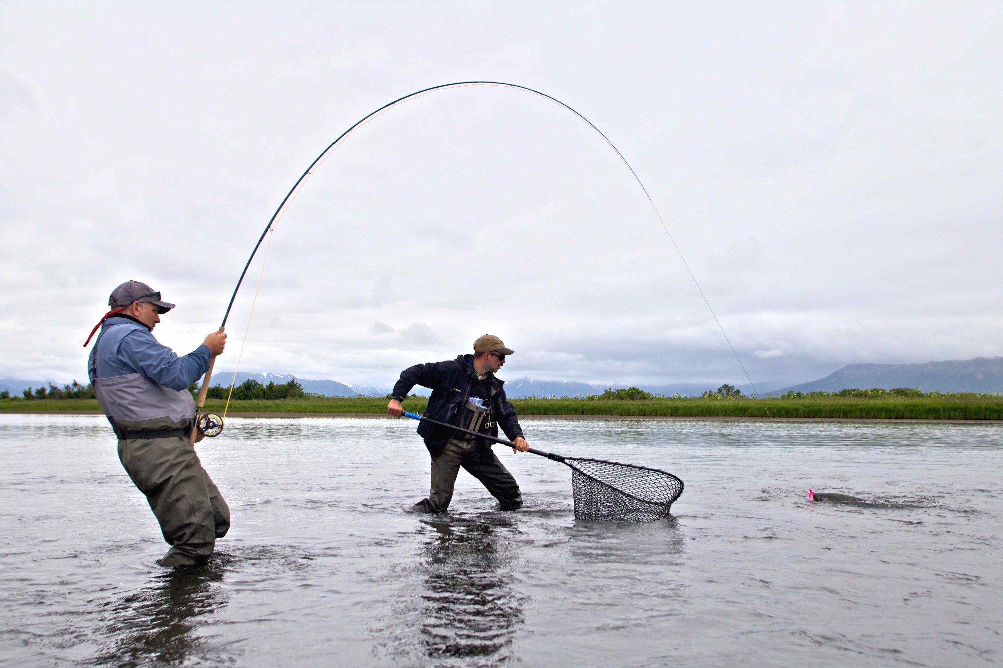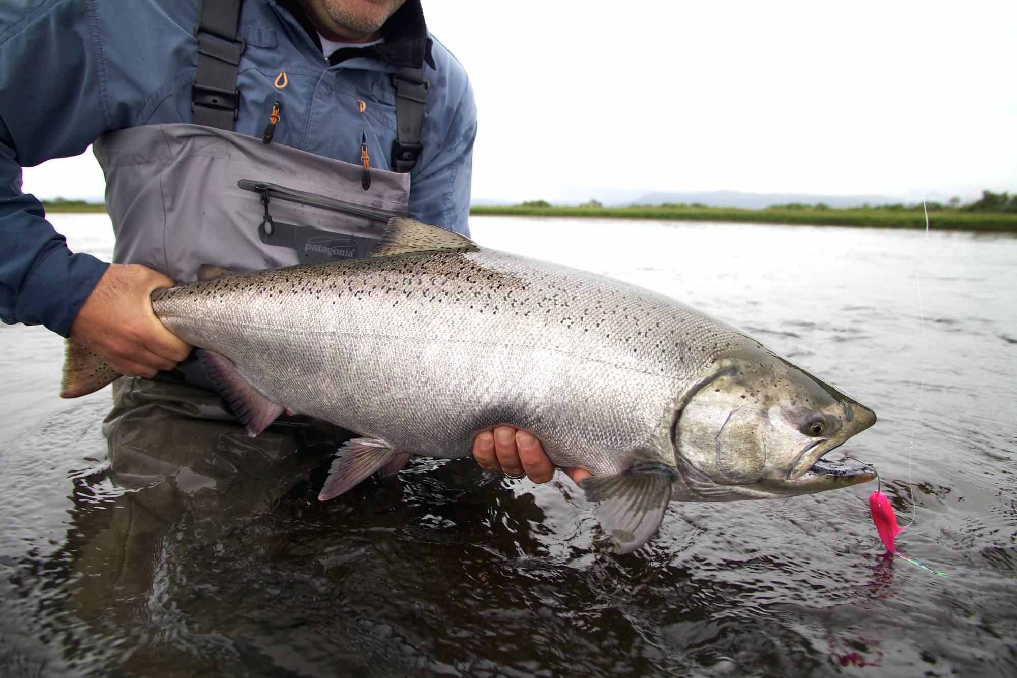 Unsere Ruten zum Fliegenfischen auf Königslachs haben wir schnell fertig: 10er Zweihandruten, schwimmende Skagit-Schnüre plus sinkenden MOW-Tips. Dazu 70 cm 0,45 Maxima als Vorfach und natürlich als Fliege wählen wir natürlich „Intruder“, Farbe Pink oder Orange, das sollte passen. Das sieht auch unser Guide so, Greg nickt zuversichtlich und führt uns an den Fluss. Und was dann passiert, habe ich nicht zu träumen gewagt! Thomas und ich stehen im knietiefen Wasser, Thomas 30 Meter stromab, unser Guide Greg zeigt auf eine Strömungskante und sagt: „Da muss die Fliege hin!“