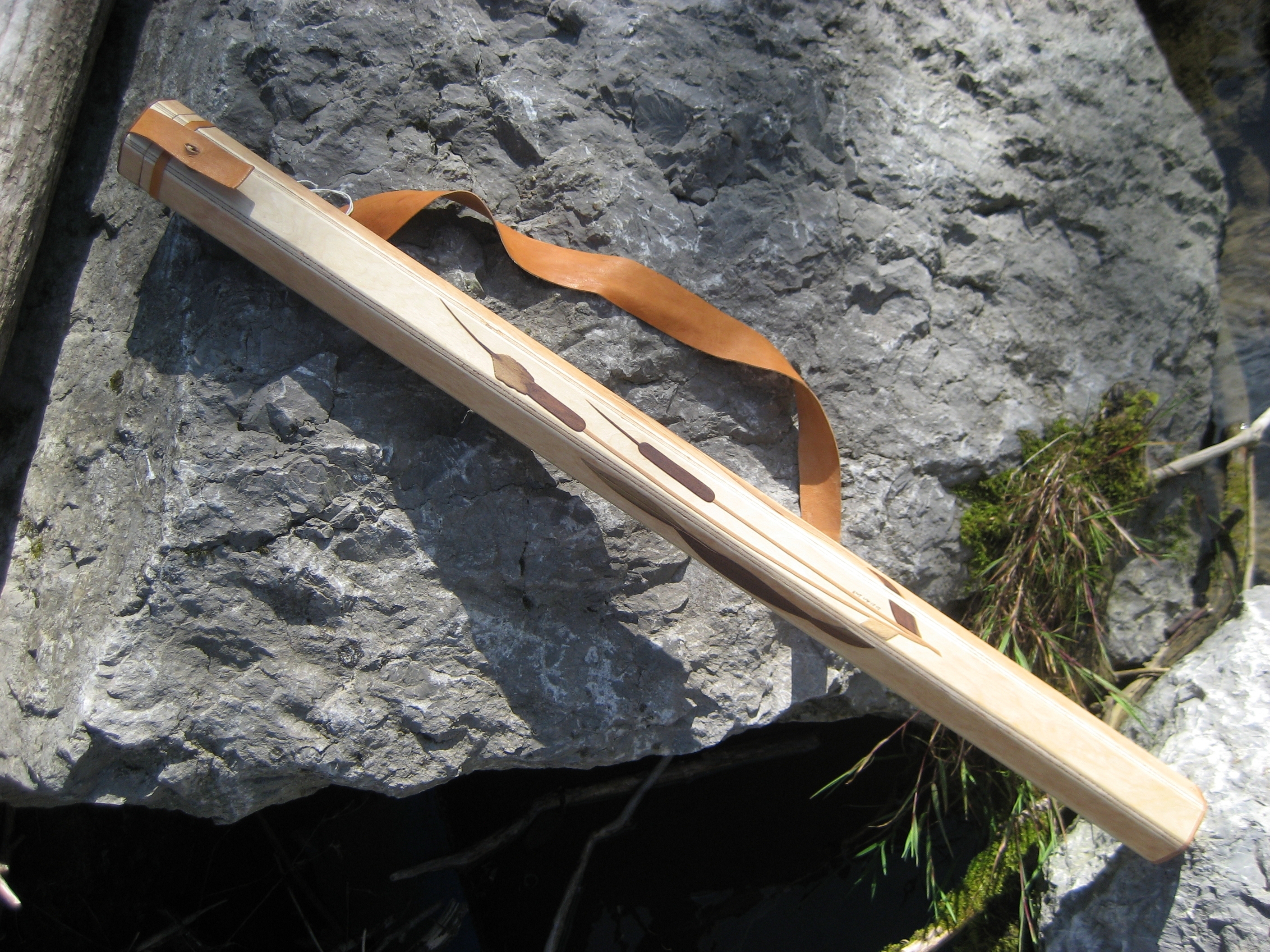 Beide Köcher wurden aus gesperrtem Pappelholz (ist leicht und verwindungsfrei) gefertigt. Die sechs Außenkanten des Köchers wurden gebrochen und ergeben so eine schöne linienförmige Verzierungsstruktur. Der obere Deckelabschluß ist aus Mahagoni Holz gefertigt. Den Bodenabschluß bildet ein zu öffnender Holzdeckel. Zum Abfluß von evt. eingedrungenem Wasser oder Feuchte, dient eine kleine Bodenbohrung. Die Deckelverschlüsse und die Tragegurte sind aus hellbraunem Rindsleder hergestellt. Die Applikationen auf den Köchern sind aus Palisander- , Mahagoniholz, Leder und echter Trockenfliege. In einem Köcher finden bis zu zwei 4-Teilruten Platz. Die Köcher sind außen im oberen und unteren Teil auch innen mit klarem Seidenmatt-Lack gestrichen. Alle verwendeten Schrauben und Muttern sind in Messingausführung.