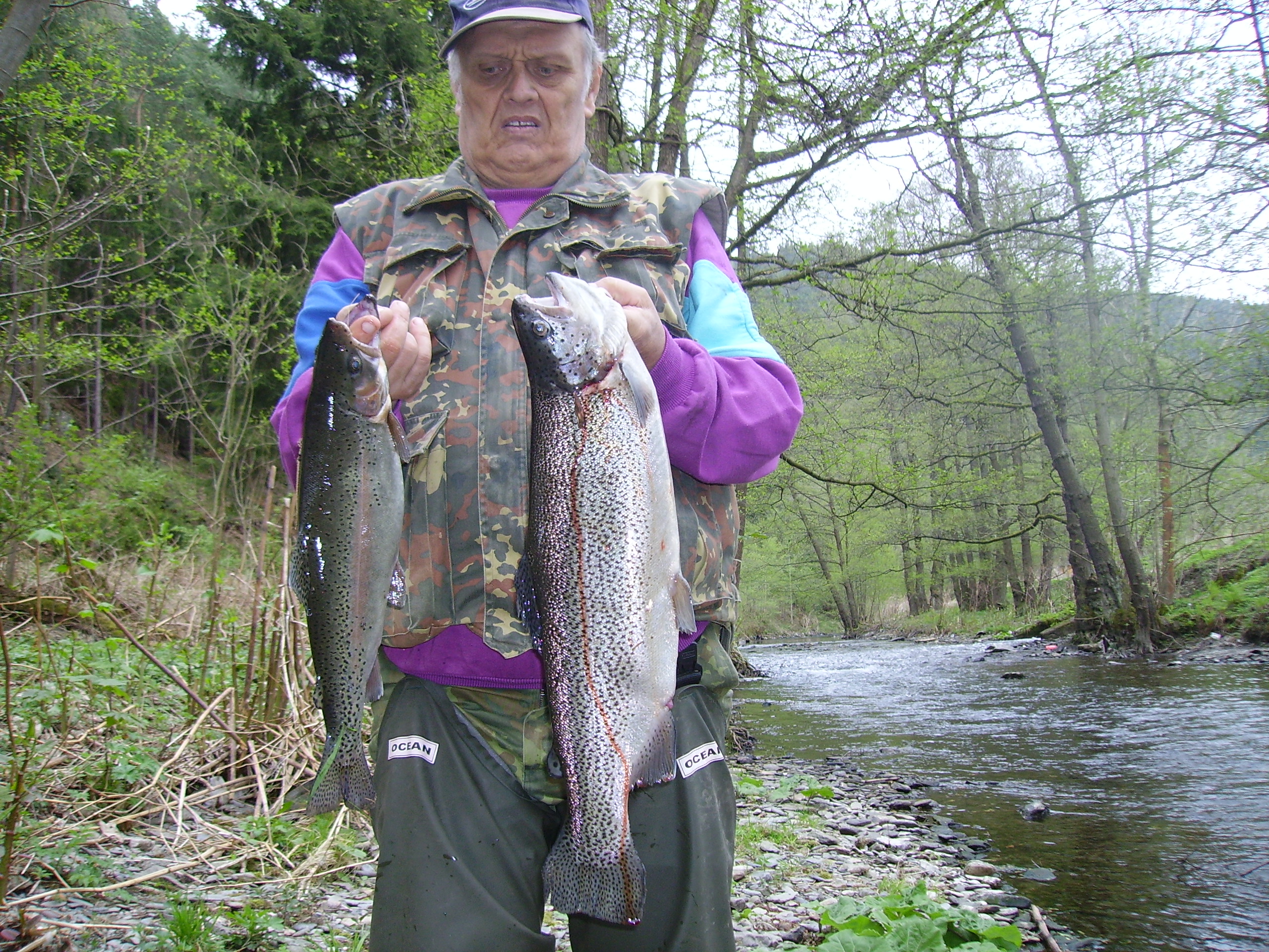 Mein Name ist Dieter Purz, ich bin schon langjähriges Vorstandsmitglied des SFV Forelle Sitzendorf e.V. und möchte Ihnen ein paar schöne Bilder von meinem ersten Angelausflug an die Schwarza, Lichtemündung Unterweißbach zeigen. Gefangen am 1. Mai diesen Jahres  gegen 10 Uhr. Auf eine Goldkopfnymphe biss die Regenbogenforelle (45 Zentimer und 1100 Gramm) kurz darauf wechselte ich auf eine graue Trockenfliege und siehe da, ich konnte nach einem ca. 25 min. Drill eine weitere 56 cm lange und 2190 Gramm schwere Regenbogenforelle landen. Die Schwarza liegt zwischen Unterweissbach, Sitzendorf und Schwarzburg und ist ein sehr begehrtes Salmonidengewässer in dem Bachforellen, Regenbogenforellen und Äschen dieser Größen keine Seltenheit mehr sind.