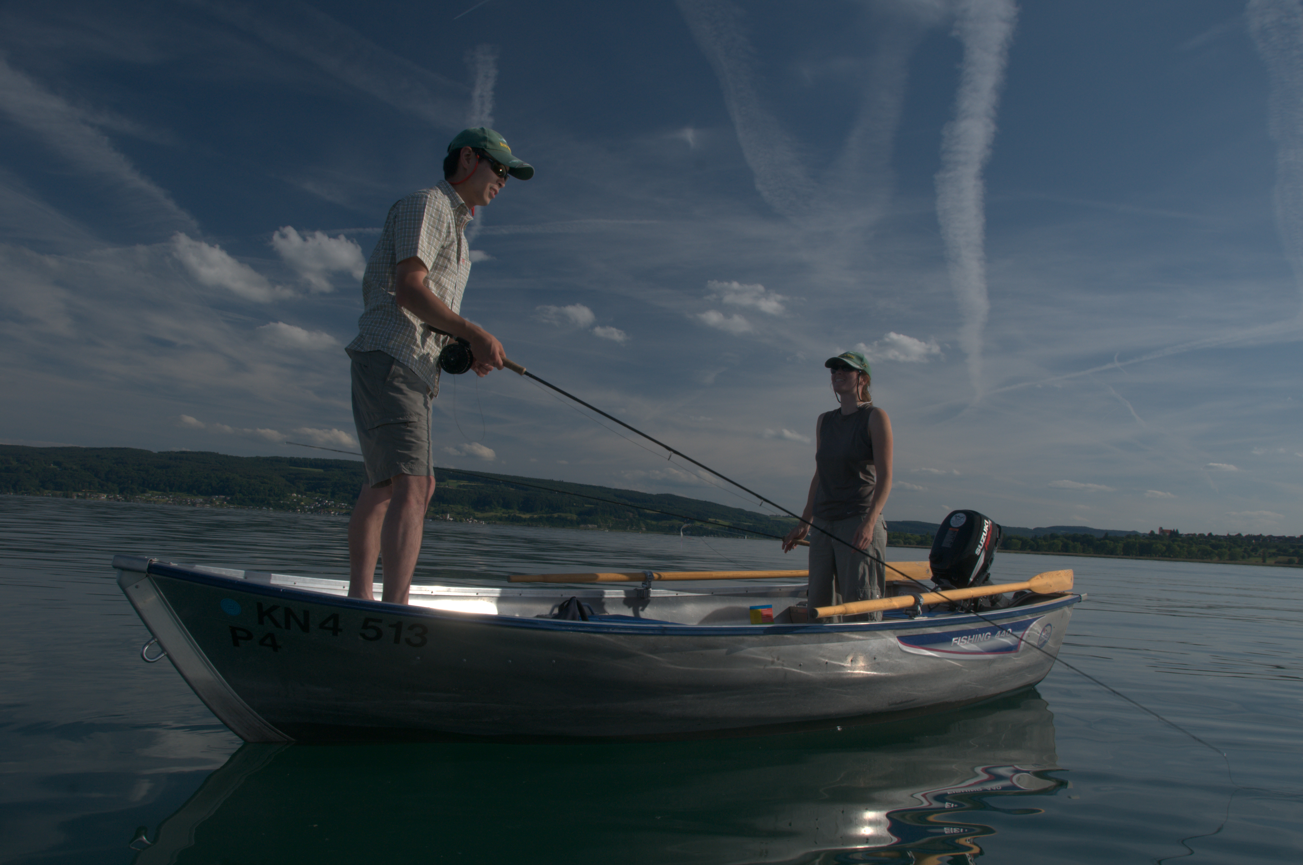 Die Fischerei mit der Fliege auf die Bodenseehechte ist recht speziell, da man an den meisten Stellen weder vom Ufer noch watend fischen kann. Ein Boot ist daher nötig um die weit draußen liegenden Kanten oder Futterfischschwärme zu erreichen. Mario Malarczuk von Marios Fliegendose und Christian Willam von Flyfishing Bodensee geben gemeinsam Kurse, in denen man alles über diese spannende Fischerei lernen und ein erholsames Wochenende verbringen kann. Es stehen 4 motorisierte Boote (Führerscheinfrei) für die Teilnehmer zur Verfügung, wobei jeweils 2 Teilnehmer pro Boot zusammen fischen. Ein extra Begleitboot mit Castingplattform zur individuellen Schulung ist ebenfalls vorhanden. So kann jeder Teilnehmer über das ganze Wochenende geschult werden im Werfen mit starkem Hechtgerät (Klasse 8-10), den dazugehörigen schweren Sinkschnüren und großen Hechtfliegen.