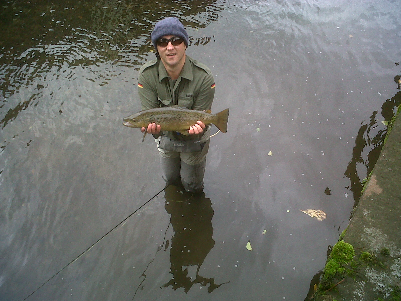 Michael Kaniecki, 31 Jahre und lebt in Darmstadt, kam bereits mit 12 Jahren in den Genuss des Fliegenfischens. Was sich ihm damals als ehrfurchteinflößende Methode der Angelei darbot ist mittlerweile, zu einer Lebenseinstellung für ihn geworden. Ergebnis ist eine schöne Bachforelle – aber, lesen Sie selbst. Am 26.9. war Michael Kaniecki an der Mud (nördlicher Odenwald) und fischte auf einer schwarz/ grünen Nymphe der Hakengröße 10. Er fischte die Nymphe am 16er Vorfach – stromauf. Mehrere Fische des Kalibers hatte er während des vorhergehenden Beobachtens in relativ starker Strömung unterhalb einer kleinen Wehrstufe beobachten können und diese dann von ungefähr 12 Metern stromab auf Verdacht angeworfen. Ergebnis ist diese schöne Bachforelle Glückwunsch.