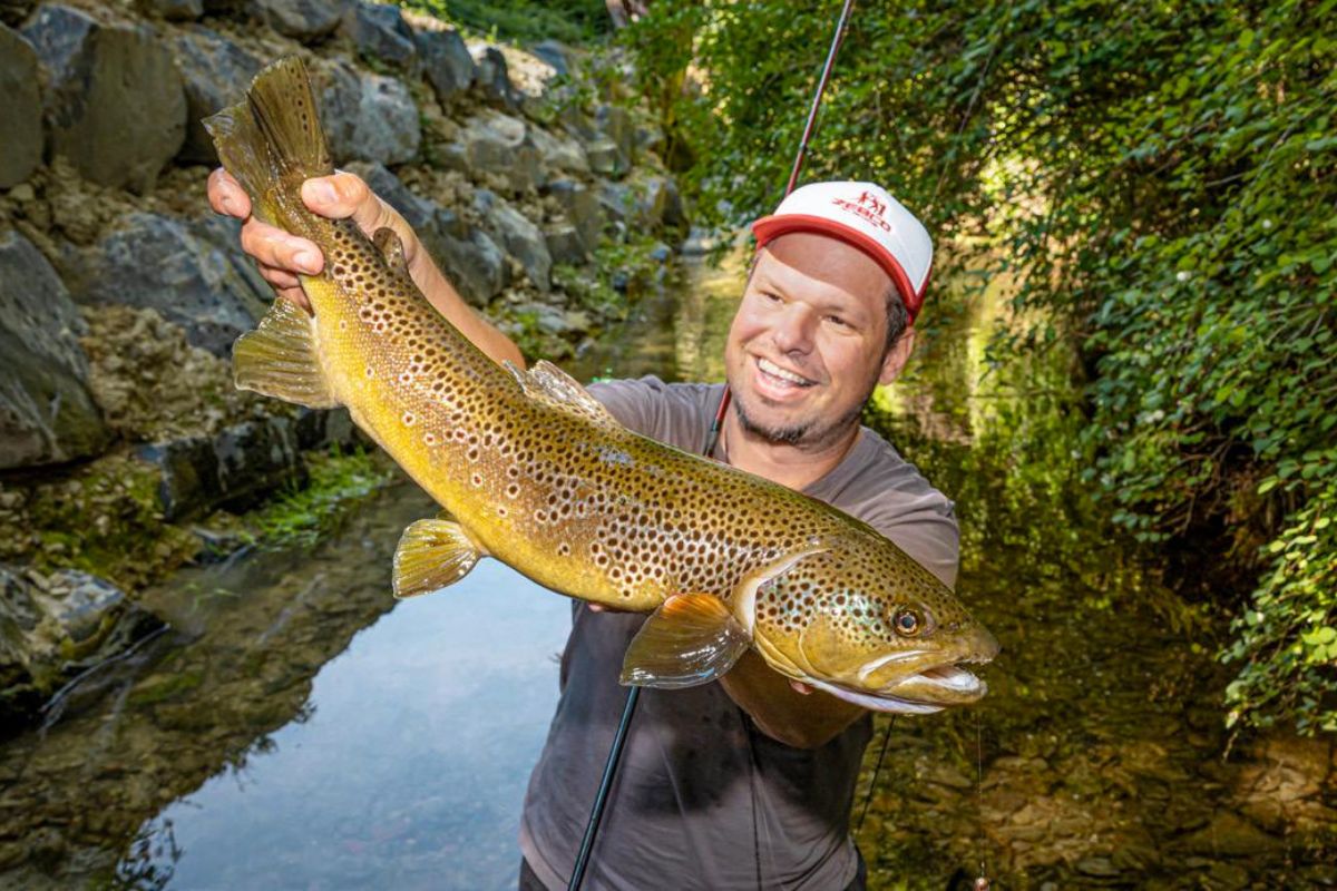 Immer wieder versucht der Fisch, seine schiere Masse einzusetzen und flüchtet teilweise flussaufwärts, dreht sich um und schießt wie ein wilder Pfeil wieder an mir vorbei flussab. Was für ein unglaublicher Kämpfer! Wenig später halte ich sie in meinen immer noch zittrigen Händen. Ein absoluter Ausnahmefang in dem kleinen Forellenbach. Ein Fang, der nur gelungen ist, weil Paul mich an den Naturköder Grashüpfer, meinen früheren Lieblingsköder, erinnerte. Danke Paul!