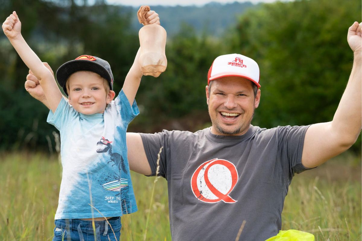 Gemeinsam auf Köderfang: Blinker-Autor Fabian Frenzel und sein Sohn Paul hatten sichtlich viel Freude beim Sammeln der kleinen Hüpfer.