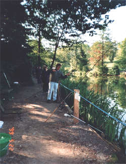 Nicht nur,daß dieser See ausgesprochen reizvoll liegt (von Sterilität keine Spur),nein,auch die Ausbeute war,wann immer wir diesen See besuchten, sehr gut.Leider ist das Gewässer nicht besonders groß(ca.80×20 m) aber es ist zum einen relativ naturbelassen und zum anderen verfügt es über kleine Schutzhütten und alle anderen Annehmlichkeiten die ein Forellenteich sonst auch bieten kann.Die durchschnittliche Tiefe liegt bei 1-1,5 m,die tiefsten Stellen bei ca.3,5 m,in der Nähe des Mönchs. Pünktlich um 5 Uhr stand Georg vor meiner Wohnung,da wir beschlossen hatten,mit einem Auto zu fahren.Nach einer knappen Stunde Fahrzeit kamen wir zum See,erst einige wenige Angler waren vor uns da.Wir hatten Glück und konnten uns noch im tieferen Bereich placieren,leider nicht mehr auf der Stirnseite aber es sollte auch so gehen.Der Köderfisch war zu verlockend, bald ist sie müde… Schnell waren die Geräte montiert in Anbetracht der Dunkelheit.Georg wollte zunächst versuchen,die Fische im „Schlepp“ zu fangen,ich hingegen fische zu dieser Jahres-und Tageszeit sehr gerne im Stand knapp über Grund. Eine Rute bestückte ich mit 3 Maden,die ich vor dem Angeln ein bischen bedandelte.Dazu nehme ich eine gewisse Anzahl von Maden,gebe sie in eine große verschließbare Madendose und fülle dann mit Wasser auf,so,das die Maden etwa zur Hälfte bedeckt sind.Die Made neigt dann dazu,sich mit Luft vollzupumpen und ich verfüge damit über einen natürlich auftreibenden Köder, vorausgesetzt,ich steche die Made mit einem sehr dünndrähtigen Haken nur sehr vorsichtig nur am Kopfende ein.Ein kleines Laufblei von 10 g mit Stopper und ein kleines Bleischrot ca.5 cm vom Haken entfernt angeklemmt,vervollständigen meine Montage. Die zweite Rute legte ich ebenfalls auf Grund,allerdings mit einem Kombi-Köder aus blauem Schwimmteig mit Made.An dieser Rute setzte ich das Bleischrot allerdings auf ca.15 cm.,da ich sehr gerne zu Beginn des Angelns versuche, unterschiedliche Tiefen abzutasten. Noch war es dunkel und Nebel zog auf,der sich wie ein dicker Teppich über den See legte. Es war empfindlich kühl, bestenfalls 1-2 Grad über Null.Erst einmal Kaffee getrunken,der zumindest innerlich ein wenig Erwärmung her-beiführte.Ganz langsam wurde es heller im Osten.Noch tat sich jedoch nichts an meinen Ruten und auch Georg hatte noch keinen Biß gehabt beim Schleppen.Wir setzten uns in die Schutzhütte,nachdem er beschlossen hatte,es auch zunächst im Stand weiter zu versuchen. Kaum hatte er jedoch Platz genommen,da begann mein Bißanzeiger höllisch zu piepsen.Ich hatte vergessen,nach dem Test den ich einen Tag vorher zu Hause durchgeführt hatte,die Lautstärke wieder zurückzuregeln.Jeder kann sich vorstellen,welch infernalisches Geräusch,bei ansonsten absoluter Stille ringsherum,über das Tal zog. Sofort war ich an der Rute,ließ den Fisch noch etwas Schnur nehmen und klappte den Rollenbügel um.Sicherheitshalber setzte ich noch einen Anhieb. Die Forelle war schon äußerst munter aber an meiner Matchrute hatte sie nicht wirklich eine Chance.Nach kurzem Drill lag sie im Kescher,eine schöne Regenbogenforelle von ca. 300 g.Schnell war sie versorgt,sie hatte im übrigen an der mit Teig/Made beköderten Rute gebissen.Ich wollte die Rute gerade wieder zum Auswurf vorbereiten,da meldete sich der Bißanzeiger meiner zweiten Rute.Ein kurzer weicher Anhieb-und auch der Fisch hing. Das ging ja munter los,so durfte es ruhig weitergehen. „Was hast du drauf?“,lautete die Frage meines linken Nachbarn.Bereitwillig gab ich Auskunft,weil ich keiner von den Anglern bin,die anderen nichts gönnen.Nach kurzem Drill lag auch sie im Kescher,vom gleichen Kaliber wie die Erste.Nachdem auch der Fisch den Weg in die Kühltasche gefunden hatte,konnte ich endlich wieder meine Ruten zum Auswurf vorbereiten.Ich kam jedoch noch nicht dazu,denn auch Georg hatte seinen ersten Biß.“Das ist eine ganz Gute“,meinte er und ich nahm den Kescher zur Hand.Er hatte schon einige Zeit mit ihr zu tun,bis er sie über den Ke-scher führen konnte.Die Forelle hatte gut und gerne 500 g. Die Angler auf der gegenüberliegenden Seite wurden schon langsam unruhig,denn ansonsten tat sich am ganzen Teich nichts.Man kann das sehr schön merken,an pausenlosem hantieren am Gerät,der ständigen Veränderung der Schwimmereinstellung und an der allgemeine Unruhe. Ganz offensichtlich standen die Forellen am-oder knapp über Grund und deswegen sah ich keine Veranlassung irgendetwas an meiner Geräteeinstellung zu verändern.Jetzt ist es soweit, der Kescher kommt zum Einsatz… Endlich konnte ich meine Ruten wieder zu Wasser bringen und es kehrte wieder etwas Ruhe ein am Teich.Ein erneuter Schluck aus der Thermoskanne und ein Brot ließen uns die empfindliche Kühle vergessen. Wir unterhielten uns über unsere Fänge und kamen übereinstimmend zu dem Schluß,das dieses wohl zur Zeit die richtige Methode sei,knapp ü-ber Grund zu fischen.Später könnte es auch anders sein. Unsere Theorie wurde auch gleich erneut bestätigt,denn abermals meldete sich der Bißanzeiger,an der nur mit Maden beköderten Rute. Der Fisch strebte unserer Uferseite zu und ich konnte ihn nur mit Mühe daran hindern,in die Schnur meiner zweiten Rute zu schwimmen.Aber auch diese Klippe wurde gemeistert und die ca. 400g-Forelle gesellte sich zu ihren Artverwandten in die Kühlbox. Auch an der Kopfseite des Sees,an der zwei jüngere Angelkollegen saßen,wurde jetzt gefangen.Jeder der beiden fing innerhalb kurzer Zeit je eine schöne Forelle.Jetzt trat zunächst einmal eine Beißpause ein,in der sich nichts-aber auch gar nichts tat. Langsam ging die Sonne auf aber es sollte noch eine ganze Weile dauern,bis der Sonnenstand so war,das wir in den Genuß von ein bischen Wärme kamen. Inzwischen war es 8 Uhr und der Teichinhaber rief zum Kartenlösen.Wir lösten unsere Karten und ich kaufte noch 10 Köderfische, kleine Rotaugen von ca.3-5 cm.Das sollte eine gute Investition sein, die sich bezah