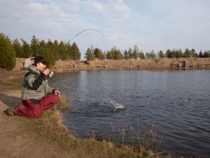 Zack! Der nächste Fisch hängt, ist aber noch lange nicht ausgedrillt. Tommy’s leichte Rute federt die Kopfstöße der Forelle ab und bewirkt, dass der Fisch den Wobbler nicht abschüttelt!